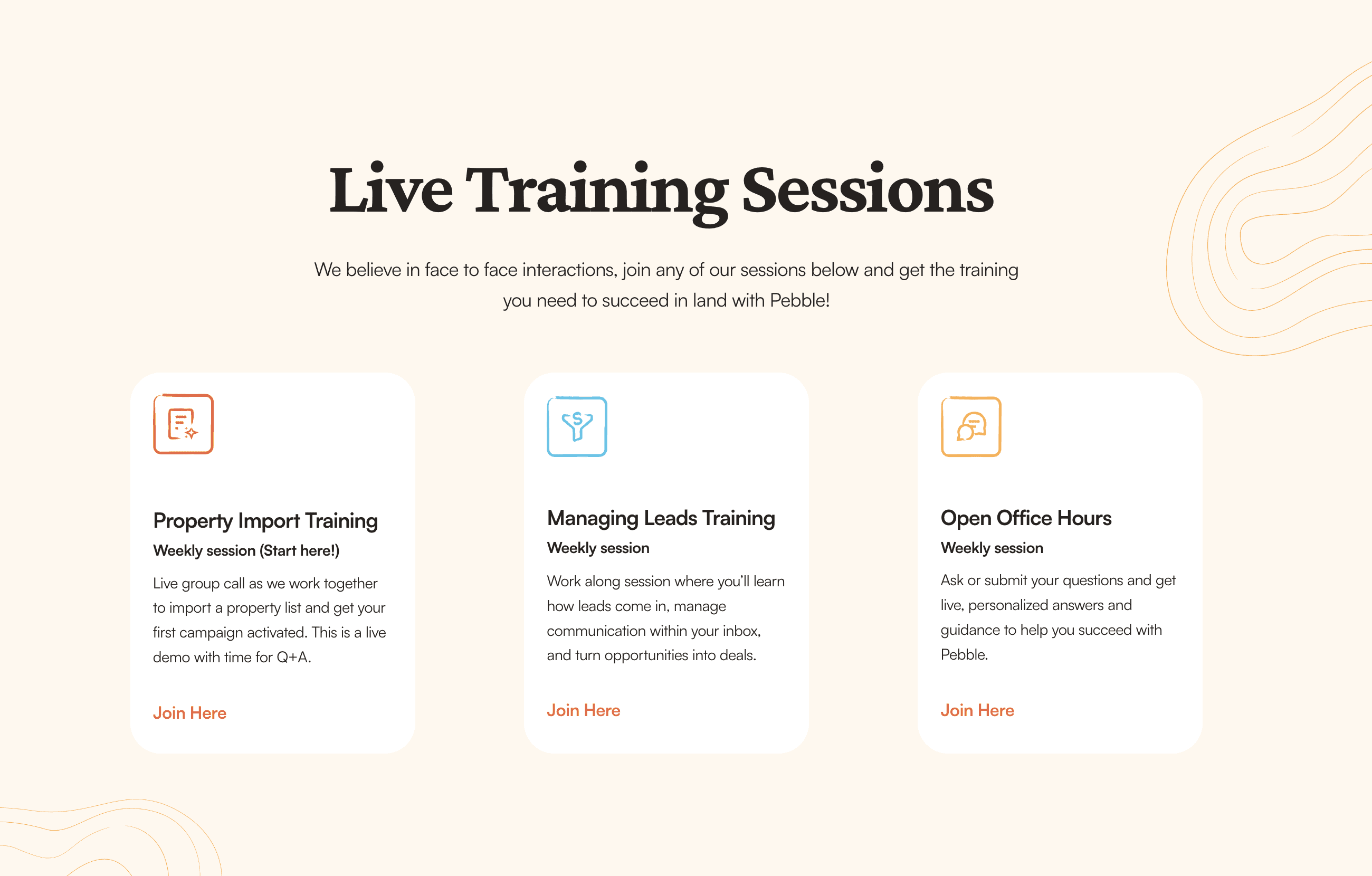 Visit pebblei.com/live-training to view schedules and join.